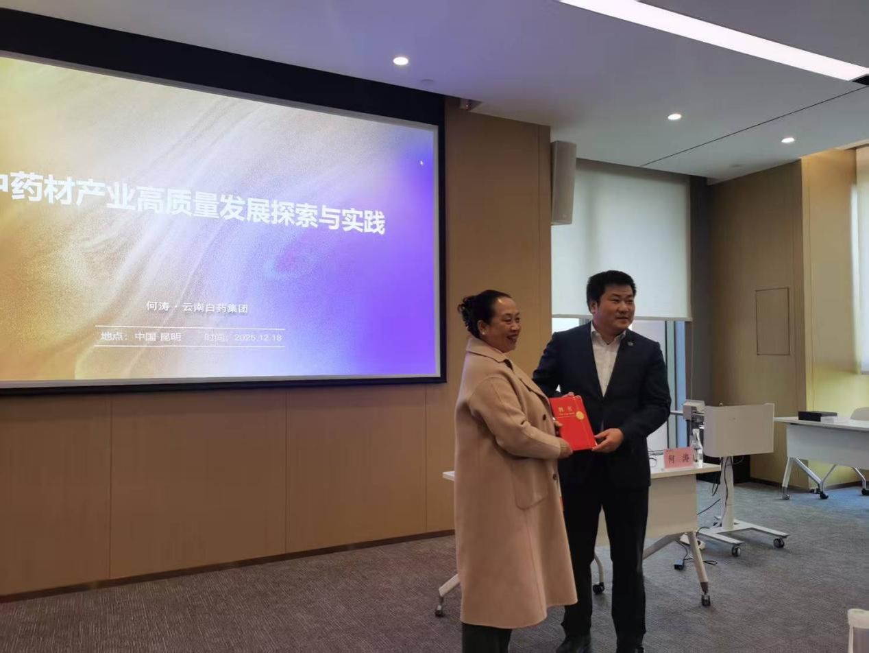 第二阶段,云南白药集团高级副总裁何涛为师生们带来“中药材产业高质量发展探索与实践”主题讲座。讲座开始前,进行了公共管理(MPA)行业导师聘任仪式,章涤凡为行业导师何涛老师颁发聘书。讲座中,何涛老师首先细致介绍了云南得天独厚的云药资源,包括以三七、滇重楼为代表的“十大云药”,滇黄精等“十大健康资源”,以及续断、山银花等兼具规模与潜力的道地药材。随后,何涛老师客观剖析了云南中药材产业当前存在的发展短板。最后,何老师分享了云南白药作为“链头”企业,在助力本地中药材产业标准化与市场化过程中的实践成果,以及后续推动产业升级的具体举措与长远规划。何涛老师的精彩讲授使师生们受益匪浅,打破了大家对中药材种植的传统理解,认识到中药材种植借助AI数字化手段能够焕发出强劲的生命力,同时,大家深深体会到云南白药作为龙头企业的责任与担当。