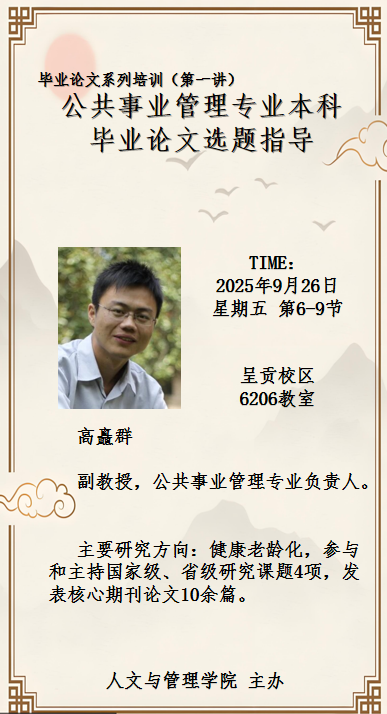 9月26日下午,高矗群在精专楼6206教室开展第一场专题培训,他“找准方向,扬帆起航”为题,从毕业论文目的意义切入,结合案例阐述优质选题标准,介绍选题来源方法,列举公共事业管理专业参考选题方向,为学生选题提供思路。