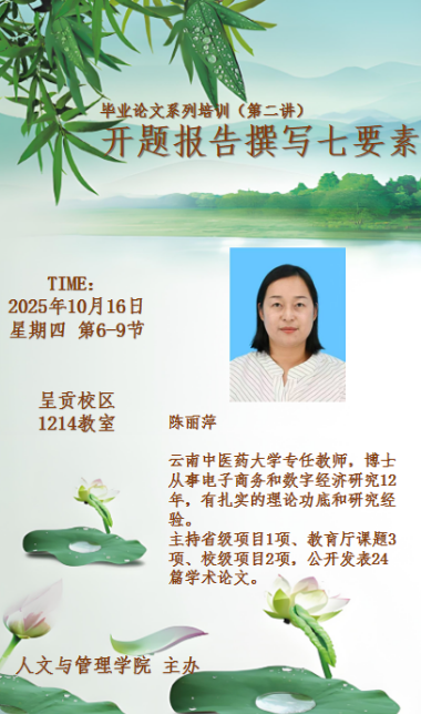 10月16日下午,陈丽萍于弘毅楼1214教室开展第二场专题培训,她围绕开题报告撰写七要素,讲解其内涵框架,强调选题需要与专业结合指导学生如何阐述研究内容与意义,说明文献综述、研究方法与框架的选取方法最后列举常见误区,提醒学生以严谨态度撰写论文开题报告
