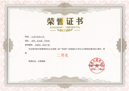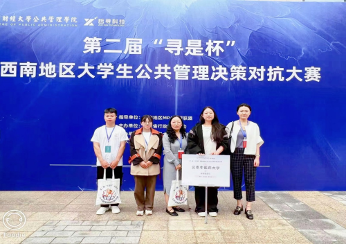 云中讯(通讯员 钱倩严慧)2023年6月2日至4日,由贵州省行政管理学会主办、贵州财经大学公共管理学院承办的第二届“寻是杯”西南地区大学生公共管理决策对抗大赛在贵阳举行。西南赛区共39支高校队伍参赛,经过激烈角逐,由我院徐颖剑、钱倩严慧作为指导老师,2020级公共事业管理专业本科生李婷、罗春林、彭远绪组成的参赛队伍荣获大赛二等奖。