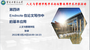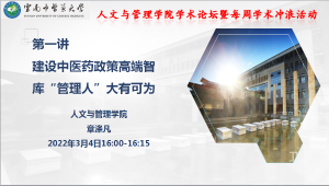 截止到3月24日,学院已开展了四期“学术冲浪”活动:即第一期——建设中医药政策高端智库,“管理人”大有可为(章涤凡);第二期——2022年国家社科基金项目申报经验交流(陈守聪);第三期——3.SCI论文发表经验分享(于博);第四期——Endnote 在论文写作中的基本应用(耿慧)。