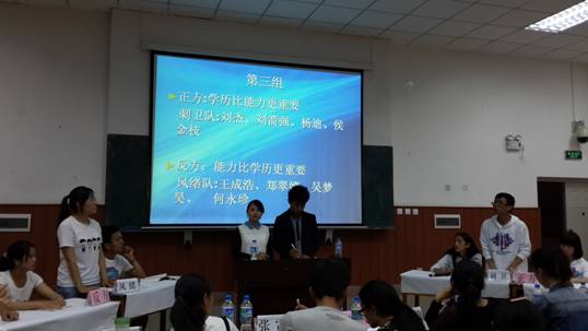 2014年4月18日下午6点,人文与管理学院在弘毅楼1111教室举行第八届“舌战杯”辩论赛初赛第二场,出席此次比赛的评委有贺婷婷老师、王雪艳老师,人文与管理学院学生会主席瞿发巧、副主席梁静,以及第七届“舌战杯”辩论赛最佳辩手张雷、马列,观看此次比赛的观众为各二级学院学生会成员以及各班班委。比赛共有六组选手参加,分三个辩题进行辩论。第一个辩题为“学历与能力哪个更重要”,正方辩手为“刺卫”队,辩手分别是刘杰、刘箭强、杨迪、侯金枝,其观点是学历比能力更重要。反方辩手为“风绪”队,辩手分别是王成浩、郑翠娜、吴梦昊、何永珍,其观点为能力比学历更重要。双方辩手针对辩题进行了激烈的辩论。