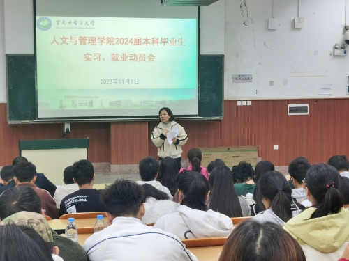 云中讯(通讯员  徐宁11月1日上午,人文与管理学院在弘毅楼1101教室召开2024届毕业生实习就业动员会。学院党总支书记陈守聪、院长章涤凡、党总支副书记蔡云海、教学办与学工办负责老师,2024届全体毕业生参会。
